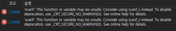 scanf() 함수를 사용하면 C4996 오류가 발생하곤 합니다.