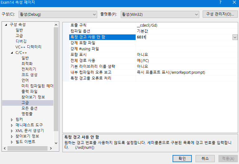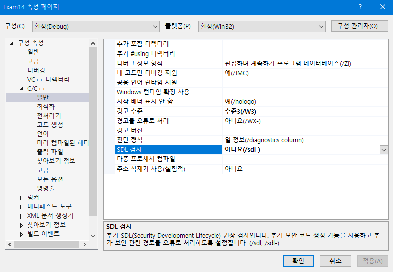 2) 왼쪽의 C/C++ - 일반 메뉴에서 SDL 검사 항목을 아니요(/sdl-)로 바꿔줍니다.