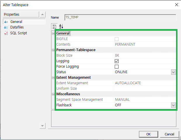 2> tablespace 편집을 누르면 옵션을 확인할 수 있다.